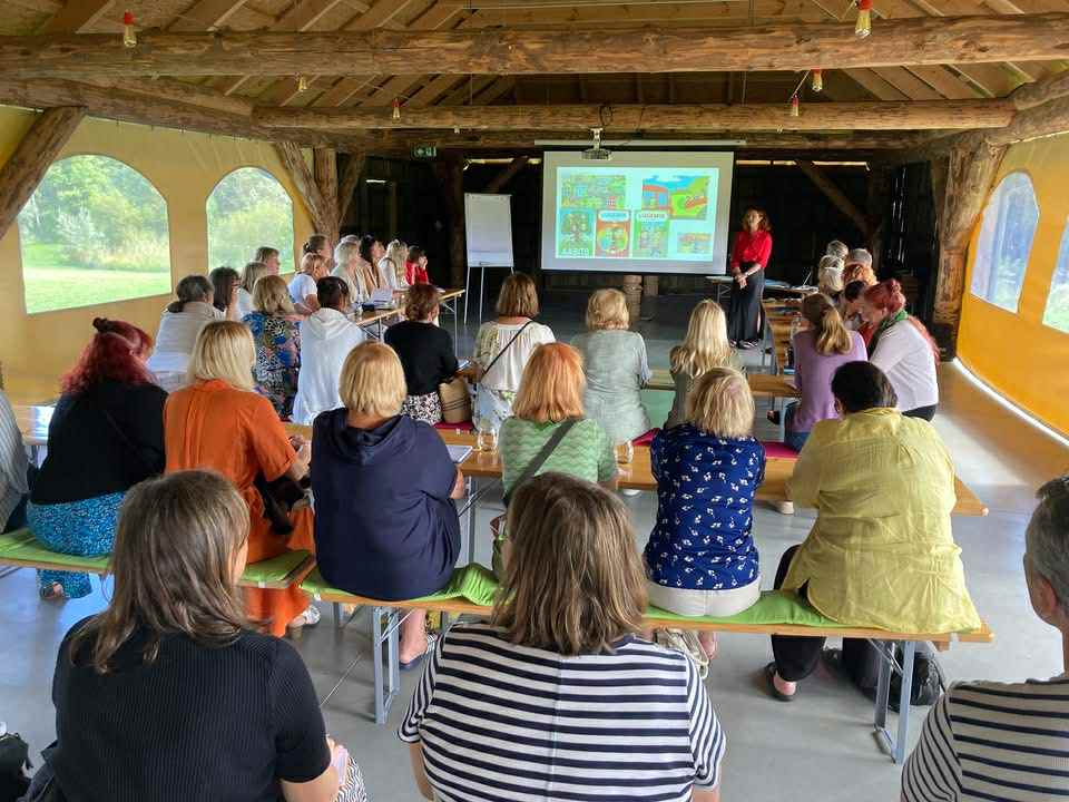 Peale lõunat oli käes minu ettekande aeg. Ega ma ei ole mingi pabistaja. Kui on vaja esineda, siis tuleb ära teha ja mida hullu see siis ikka on. Üldiselt räägid ju teemal, milles oled tugev. Nojah, aga kui midagi peab üllatama, siis miski ikka üllatab. Võtsin oma 10 lk lisamaterjali, mida slaidide kõrvale rääkida ja läksin pulti 10 minutit enne esinemist ja mida ma avastasin? Eelmisel päeval prinditud materjalidest vaid kahel esimesel lehel oli kogu tekst nähtav, ülejäänutel…..jooksis ülevalt alla 6-7 cm laiuselt valge tühi riba. Nojah, mis teha. Sain endale õnneks tõestatud, et vanadusseniilsus veel ei kummita. Väga palju sellest tekstist oli paberitetagi meeles. Ehk oligi hea, et läks nii. Ettekanne tuli spontaanne, südamest ja humoorikas, sest ma ei pidanud paberilt järge ajama. Üks väga lugupeetud lastekirjanduse uurija ja pikaajaline lastetöötaja, kes on ka fantastiline ja hinnatud esineja, tegi mulle pärast komplimendi, mida ma väga hindan – “Mul on su ettekandele vaid üks etteheide! Ma ei saanud üldse tukkuma jääda!!!”