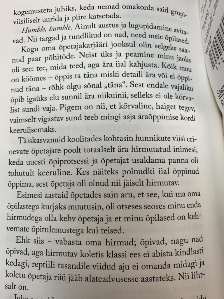 Kerge lugemine ja rõõm, et mina pole seni selliseid napakaid koole ja inimesi kohanud :D Ja ühe väga hea mõttekäigu leidsin sealt, kus jutt hirmust õpetaja ees. Ilmselgelt tuleb see tuttav ette igale inimesele, kes koolis käinud.