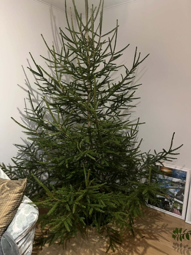 Koju jõudes tekkis mul pisuke segadus, et kust on tekkinud jalatsiriiulile kuuseokkad. Mõtlesin, et küllap tütar võttis ülevalt kapist jõuluasju ja sealt pudenes. Siis aga nägin ka põrandal parasjagu kuuseokkaid ja lõpuks koitis. Kui on midagi sellist kahtlast, on poeg käinud salaja ja toonud mulle tuppa kuuse. Vaatasin elutuppa…ja seal see kaunitar seisiski. Seda ta mulle õhtul kirjuts ja uuris, kas ma olen kodus ja millal tulen ning lubas järgmisel päeval külla tulla. Niisama.