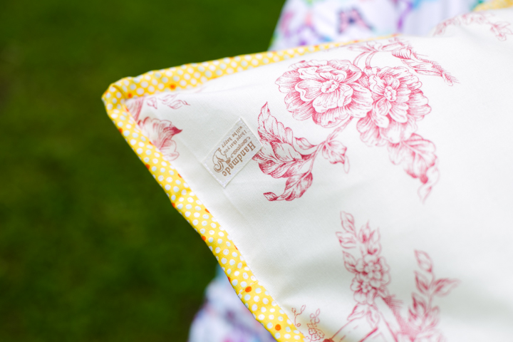 Pealt nagu ikka puuvillasest õhemast kangast, lisandiks puuvillane pits. Kogu pealne on tepitud vabakäeliselt vatiinile. Tagumine pool on tugevamast puuvillasest dekoratiivkangast ja kinniseks seekord kaetud peitelukk.
